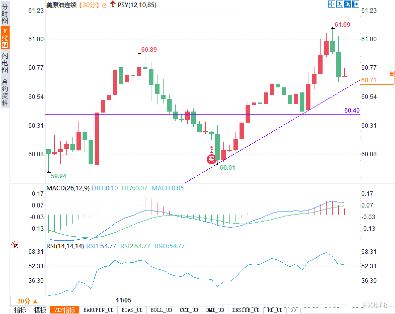 周三(11月5日),美原油(WTI主力)欧洲时段围绕60.70美元交投;早些时候价格一度靠近60.00附近随后回升。盘面呈现“数据偏空—地缘偏多—技术修复”的交织格局,短期主导因子转向当晚的EIA商业原油库存。
