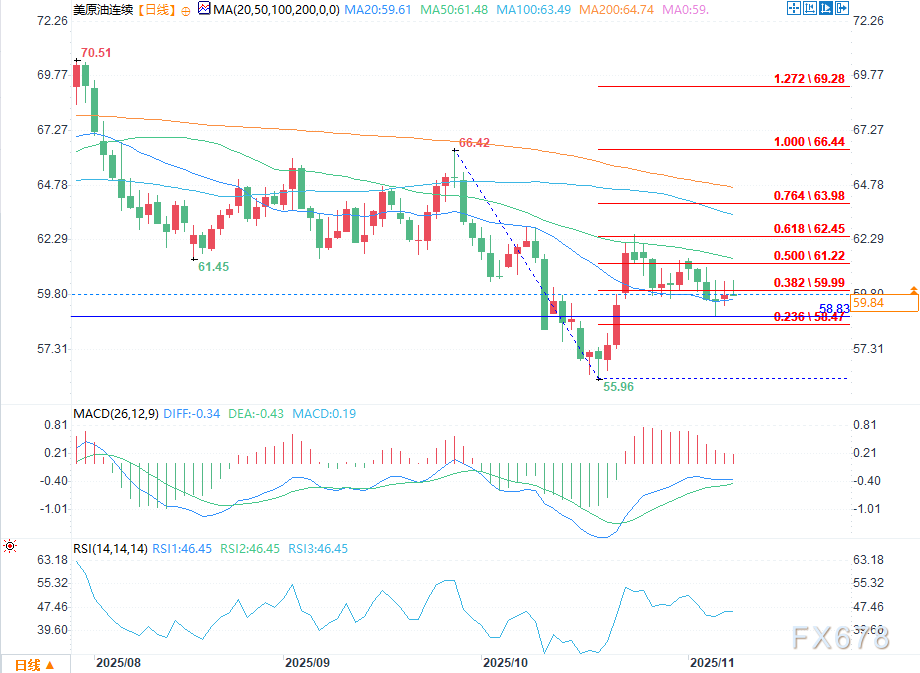 周一(11月10日)欧盘时段,WTI原油期货在收复隔夜部分涨幅后持稳。价格位于50日均线61.48美元和20日均线59.61美元之间。