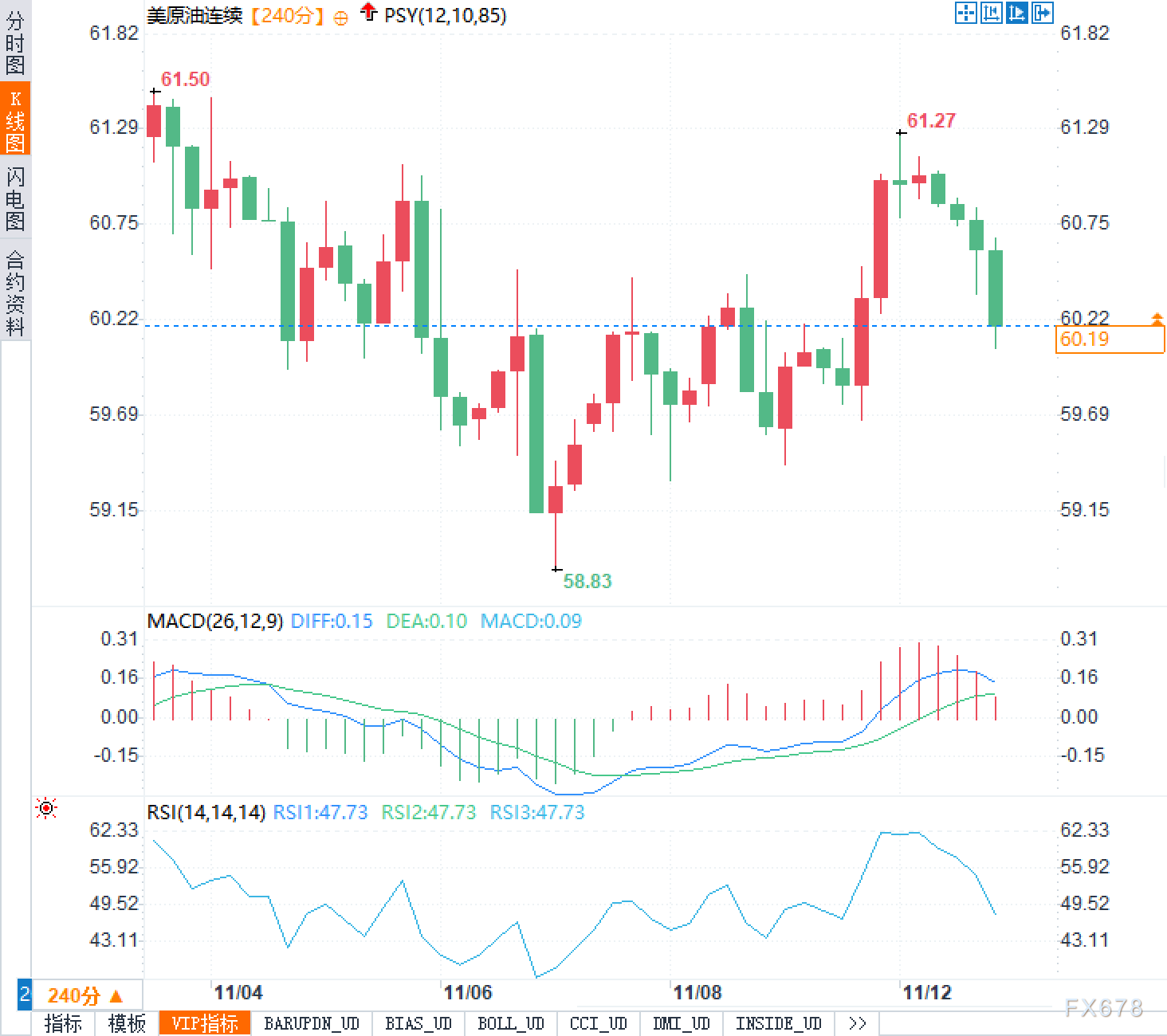 4小时级别看,美原油围绕60.20美元震荡。上方冲击61.27而未延续,叠加前高61.50,构成短期阻力带;下方多次在59.7—59.9获得支撑,阶段低点58.83仍是关键锚。K线实体与影线交替,显示分歧较大、趋势性不强。